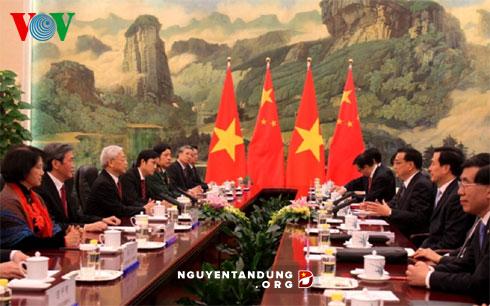 ທີ່ການເຈລະຈາ, ພົບປະຄັ້ງຕ່າງໆ, ທ່ານເລຂາທິການໃຫຍ່ ຫງວຽນຟູຈ້ອງ ແລະ ບັນດາການນຳຈີນ ພ້ອມກັນເນັ້ນຫນັກວ່າ: ຫວຽດນາມ ແລະ ຈີນ ຈະສືບຕໍ່ຢືດໝັ້ນຄວາມມານະພະຍາຍາມປະຕິບັດທິດນຳ “ບ້ານໃກ້ເຮືອນຄຽງມິດຕະພາບ, ການຮ່ວມມືຮອບດ້ານ, ສະຖຽນລະພາບຍາວນານ, ມຸ່ງໄປເຖິງອະນາຄົດ” ແລະ ນ້ຳໃຈ “ບ້ານໃກ້ເຮືອນຄຽງທີ່ດີ, ເພື່ອນມິດທີ່ດີ, ເພື່ອນສະຫາຍທີ່ດີ, ຄູ່ຮ່ວມມືທີ່ດີ”, ກຳແຫນ້ນທິດທາງພັດທະນາຂອງການພົວພັນ ຫວຽດນາມ - ຈີນ, ຊຸກຍູ້ການພົວພັນຄູ່ຮ່ວມມື ການຮ່ວມມືຍຸດທະສາດຮອບດ້ານ ຫວຽດນາມ - ຈີນ ພັດທະນາຢ່າງບໍ່ຢຸດຢັ້ງໃນອະນາຄົດ. ສອງຝ່າຍ ເຫັນດີ ສືບຕໍ່ຮັກສາມູນເຊື້ອອັນດີງາມຂອງການພົບປະຂັ້ນສູງລະຫວ່າງສອງພັກ, ສອງລັດ ດ້ວຍຫລາຍຮູບການ, ແລກປ່ຽນຄຳເຫັນກ່ຽວກັບສະພາບການສາກົນ, ພາກພື້ນ ແລະ ບັນດາບັນຫາສຳຄັນໃນການພົວພັນສອງຝ່າຍຢ່າງທັນການ, ແລກປ່ຽນບັນຫາຍຸດທະສາດຢ່າງເລິກເຊິ່ງ, ປັບປຸງຄວາມໄວ້ເນື້ອເຊື່ອໃຈດ້ານການເມືອງ, ເພີ່ມທະວີການຊີ້ນຳນຳພາ ສຳລັບການພັດທະນາການພົວພັນ ຫວຽດນາມ - ຈີນ. ປະຕິບັດ “ໂຄງການດຳເນີນງານຜັນຂະຫຍາຍການພົວພັນຄູ່ຮ່ວມມື ການຮ່ວມມືຍຸດທະສາດຮອບດ້ານ ຫວຽດນາມ - ຈີນ, ສອງຝ່າຍພ້ອມກັນຊຸກຍູ້ການຮ່ວມມືຢ່າງແທດຈິງໃນທຸກຂົງເຂດລະຫວ່າງສອງປະເທດ. ສອງຝ່າຍຕັ້ງຫນ້າຊຸກຍູ້ການພົບປະແລກປ່ຽນການຮ່ວມມືມິດຕະພາບລະຫວ່າງສະພາແຫ່ງຊາດຫວຽດນາມ ກັບສະພາຜູ້ແທນປະຊາຊົນແຫ່ງຊາດຈີນ, ລະຫວ່າງແນວໂຮມປະເທດຊາດຫວຽດນາມ ກັບສະພາປຶກສາການເມືອງປະຊາຊົນແຫ່ງຊາດຈີນ.