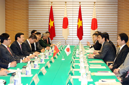 ພ້ອມກັບບົດກ່າວປາໄສສຳຄັນຕໍ່ສະພາແຫ່ງຊາດຍີ່ປຸ່ນ, ທ່ານປະທານປະເທດ ເຈືອງເຕີນຊາງ ແລະ ທ່ານນາຍົກລັດຖະມົນຕີ ຍີ່ປຸ່ນ Shinzo Abe ໄດ້ມີການເຈລະຈາສຳເລັດຜົນ. ຜູ້ນຳທັງສອງທ່ານ ໄດ້ອອກຖະແຫລງການຮ່ວມກ່ຽວກັບການສ້າງສາຍພົວພັນຄູ່ຮ່ວມມືຍຸດທະສາດຢ່າງເລິກເຊິ່ງ ກວ້າງຂວາງ ເພ່ືອສັນຕິພາບ ແລະ ຄວາມຈະເລີນຮຸ່ງເຮືອງຢູ່ ອາຊີ ລະຫວ່າງຫວຽດນາມ ແລະ ຍີ່ປຸ່ນ. ທ່ານປະທານປະເທດ ເຈືອງເຕີນຊາງ ໃຫ້ຮູ້ວ່າ: