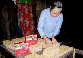 “ໜຶ້ງເຂົ້າໜຽວໃຫ້ສຸກແລ້ວໂຮຍແປ້ງໃສ່ເພື່ອບໍ່ໃຫ້ເມັດເຂົ້າໜຽວຕິດໃສ່ກັນ, ຫຼັງຈາກນັ້ນເຂົ້າເຈົ້າຈະໜີບໃຫ້ເມັດເຂົ້າແວບລົງ, ແລ້ວຕາກແຫ້ງ. ເມື່ອໃກ້ຈະຮອດວັນບຸນຈຶ່ງນຳໄປຂົ້ວ ແລະ ເຊື່ອມກັບນຳ້ຕານກ້ອນ “.