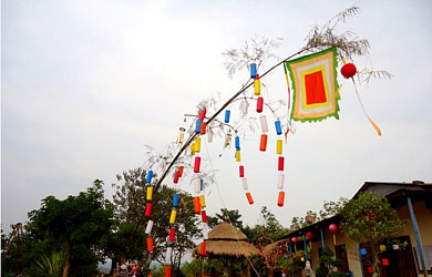 “ຮູບຄົນປອມເຄີຍແຂວນເທິ່ງຍອດ ຕົ້ນໄມ້ໄຜ່. ແຕ່ລະປີ, ເຂົາເຈົ້າມັກແຕ່ງຂຶ້ນອັນໃໝ່. ທາງດ້ານສິລະປະ, ຮູບຄົນປອມຈະຖືກຕົກແຕ່ງໜ້ອຍໜຶ່ງເພື່ອໃຫ້ສອດຄ່ອງກັບສັງຄົມຍຸກປະຈຸບັນ. ຢູ່ກ້ອງຕົ້ນໄມ້ໄຜ່ ກໍປູກຕົ້ນໝາກໜັດເພື່ອຂັບໄລ່ຜີສາງ, ສ່ວນຕົ້ນໄຮແມ່ນໝາຍເຖິງຕົ້ນໄມ້ໃຫຍ່ມີຮົ່ມເຢັນເພື່ອໃຫ້ບັນດາວິນຍານຂອງບັນດາຜູ້ເສຍຊີວິດມາພັກພາອາໄສ”