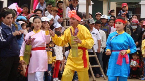 ພາຍຫຼັງຊຸມວັນຝົນຕົກ, ໃນສວນຮູບປັ້ນຢູ່ ໂຫ້ຍອານ, ກວາງນາມ ນັກທ່ອງທ່ຽວກໍ່ມາຍັງເດີ່ນບ່າຍຈ່ອຍເປັນຈຳນວນຫຼວງຫຼາຍ. ຢູ່ກາງເດີ່ນເຂົາເຈົ້າໄດ້ປະລຳໄມ້ໄຜ່ທີ່ບັນຈຸໃບໄພ້ໄວ້, ສຽງກອງງານບຸນກໍ່ດັງຂຶ້ນ. ທຸງຫາງປາ ສີບົວຫາກໍ່ຫຍິບໃໝ່ເພື່ອແຈກໃຫ້ຜູ້ຫຼິ້ນທີ່ໄດ້ຮັບຊະນະ. ໂຄສົກບ່າຍຈ່ອຍ ຫວໍທິເຟືອງຮ່ວາຍ ພວມແນະນຳວິທີຫຼິ້ນວ່າ:
