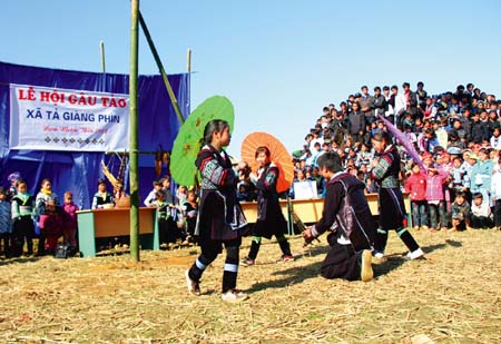 ງານບຸນ ເກົາຕາວ ຊຶ່ງແມ່ນງານບຸນທີ່ເປັນເອກະລັກສະເພາະຂອງພໍ່ແມ່ພີນ້ອງເຜົ່າມົ້ງ ທີ່ມາຈາກຕາແສງ ເດືອງເຖື້ອງ ເມືອງອຽນມິນ ແຂວງ ຮ່າຢາງ. ສຽງຂຸ່ຍ, ສຽງແຄນປະສານກັບສຽງຂັບຮ້ອງທີ່ອ່ອນຊອນເພື່ອຕອບບຸນແທນຄຸນຕໍ່ເທວະດາຟ້າແຖນທີ່ໄດ້ດົນບັນດານໃຫ້ລູກຫຼານ, ລະດູການຜະລິດໄດ້ຮັບຜົນດີຂອງ ເຈົ້າເຫຼົ່າ ຊ່ອງລໍ້ຢ່າງ ຊາວເຜົ່າມົ້ງໃນງານບຸນ ເກົາຕາວ ປຽບເໝືອນ ການສົ່ງສັນຍານກ່ຽວກັບຫຼາຍ ງານບຸນທີ່ເປັນເອກະລັກສະເພາະຖືກຈັດຂຶ້ນຢູ່ແຫ່ງນີ້ອີກ. ຕົ້ນໄມ້ໄຜ່ຖືກຊາວເຜົ່າ ມົ້ງຕັ້ງຂຶ້ນຢູ່ສະຖານທີ່ໃຈກາງໝູ່ບ້ານເລກ 1 , ຢູ່ເທິ່ງຮ່າງຕົ້ນໄມ້ໄຜ່ ກໍແຂວນໄຫເຫຼົ້າ, ຜ້າສີແດງຕອນໜຶ່ງເພື່ອລາຍງານຕໍ່ ເທວະດາຟ້າແຖນ ແລະ ທັງເປັນການເຊື້ອເຊີນປະຊາຊົນບັນດາເຜົ່າໃນໝູ່ບ້ານມາຮ່ວມມ່ວນຊື່ນນຳກັນ. ຖ້າຫາກວ່າຢູ່ທ້ອງຖິ່ນ, ງານບຸນ ເກົາຕາວ ຖືກຈັດຂຶ້ນເພື່ອພາວະນາຂໍໃຫ້ມີຄວາມຢູ່ເຢັນເປັນສຸກໃຫ້ແກ່ເຈົ້າຂອງເຮືອນນັ້ນ, ແຕ່ຢູ່ ໝູ່ບ້ານວັດທະນະທຳທ່ອງທ່ຽວບັນດາເຜົ່າ, ງານບຸນ ເກົາຕາວ ຖືກຈັດຂຶ້ນເພື່ອພາວະນາໃຫ້ນຳຄວາມໂຊກດີມາສູ່ທັງວົງຄະນະຍາດຊາວເຜົ່າມົ້ງຢູ່ແຫ່ງນີ້. ງານບຸນບໍ່ພຽງແຕ່ເປັນແຫ່ງເພື່ອໃຫ້ພວກອ້າຍບາວ, ນາງສາວໄດ້ພົບກັນ, ສ້າງຄວາມຮັກ ແລະ ກາຍເປັນບັນດາຄູ່ຜົວເມຍທີ່ຜາສຸກ. ທ້າວຢ່າງມີຟື້ ຊາວເຜົ່າມົ້ງເວົ້າວ່າ :