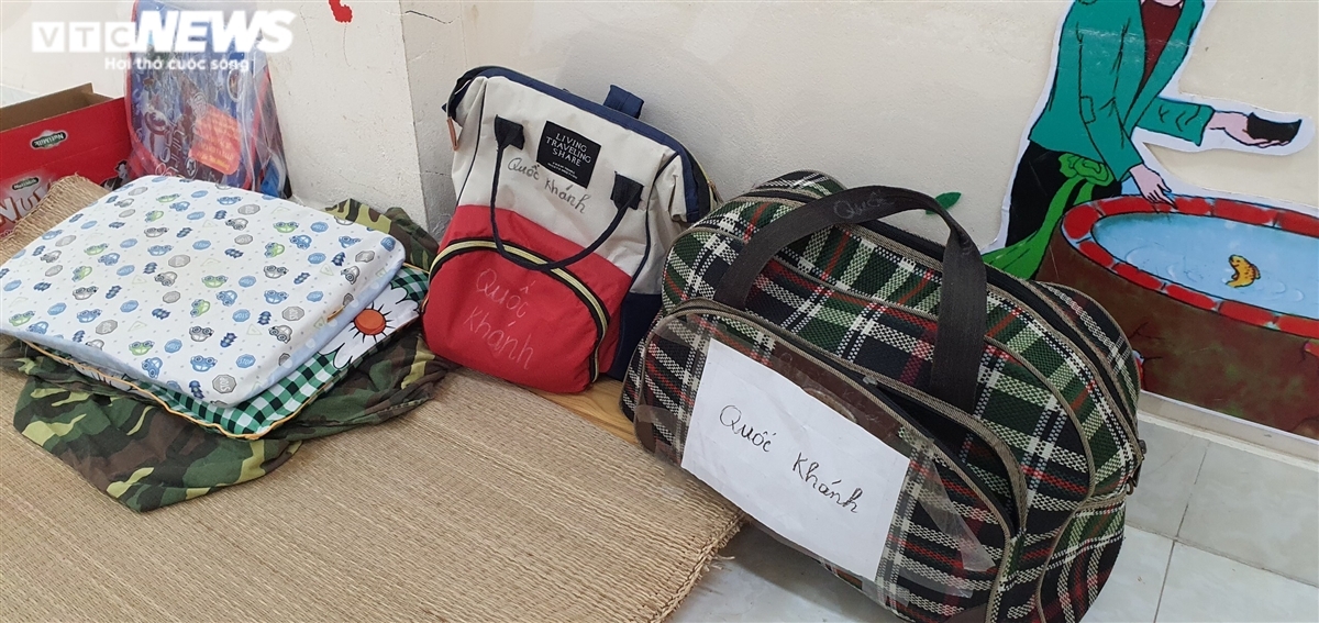 The belongings of the children are labeled with their names and neatly arranged in the quarantine area. |