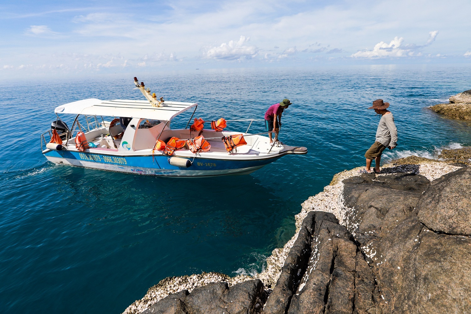 Leaving Bay Canh Islet, the group headed to Cau Islet, which does not have any visible A-landmark, though another local milestone helps define Vietnam’s sovereignty. With no road to the landmark, the boat had to dock on the slippery rocks, surrounded by many sharp oysters. An said Cau Islet’s rugged beauty made it his most favorite out of all islands.