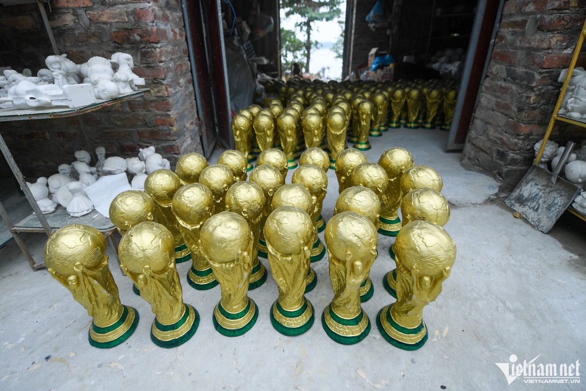 | The ceramic workshop of artisan Vuong Hong Nhat in Bat Trang commune, Gia Lam district, is full of models of the trophy of the 2022 World Cup. |