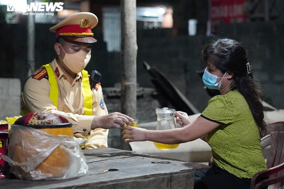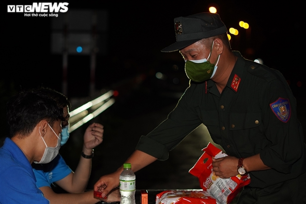 On-duty officials take turns to have a quick dinner at 10 p.m. at a checkpoint on Phap Van-Cau Gie highway. Instant noodles with boiled eggs prove to be popular dishes at night.