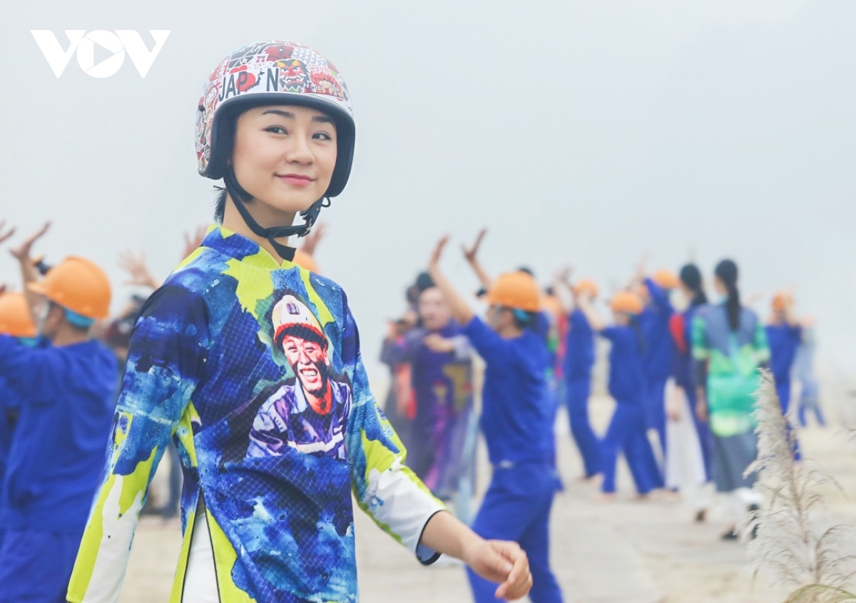 The images of coal mine workers are featured on an Ao Dai collection by designer Cao Duy. |