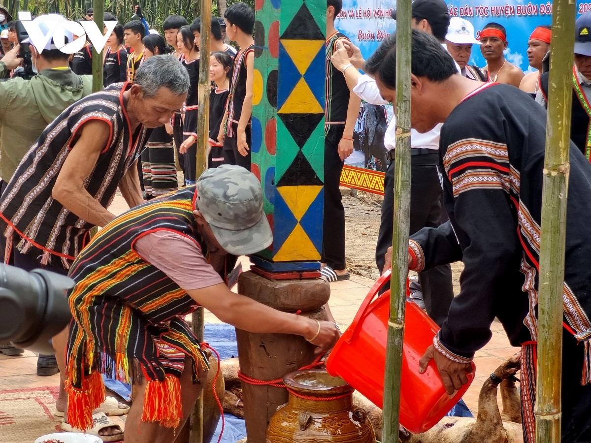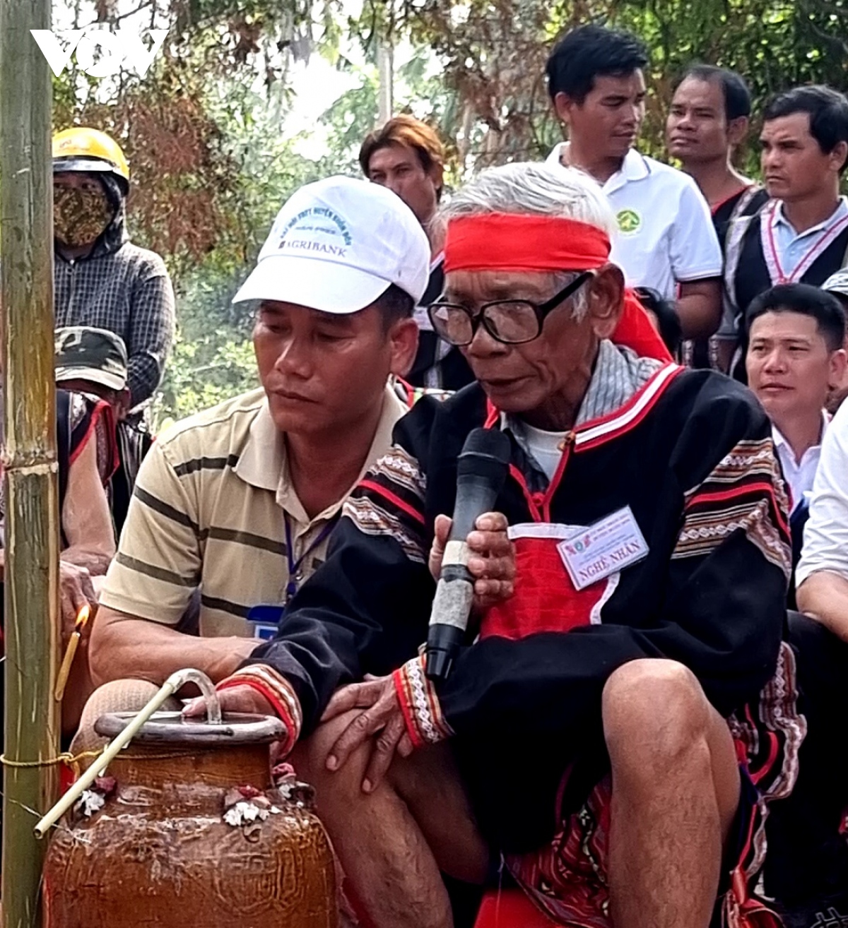 After the preparations, sham Y Han Bkrong began the wharf worshiping ceremony. The Mnong ethnic minority's worshiping ceremony consists of 3 parts: worshiping ancestors, the wharf, and a thanks giving ceremony. The shaman was responsible for every steps in the ceremony, after which he began chanting beside the straw liquor jars. (Photo: H Xiu/VOV)