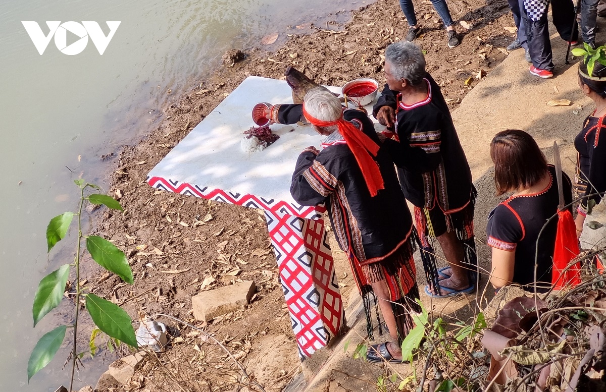 The group of people then moved to the riverside, where they continued their ceremony in marked spots to give thanks to their water god for the fresh water, bumper crops, and prosperity. (Photo: H Xiu/VOV) |
