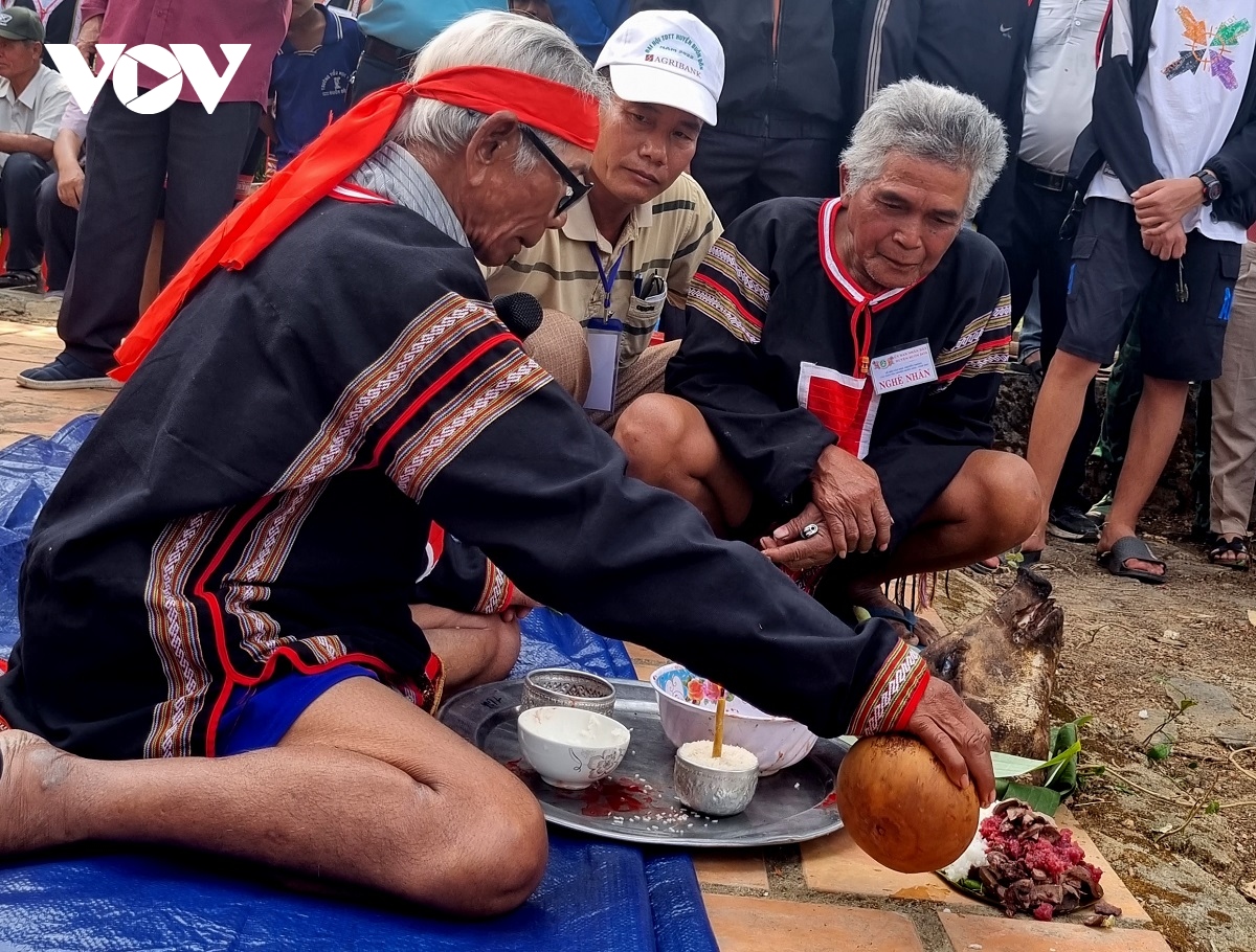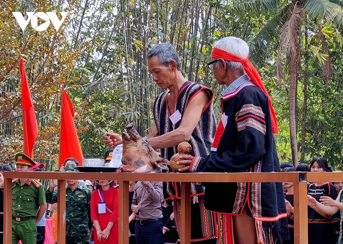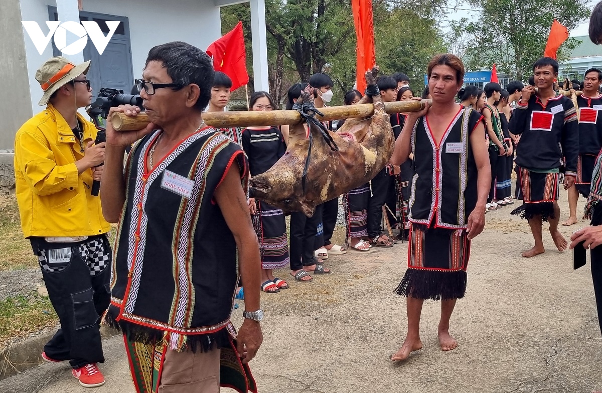 Behind the shaman were his assistants carrying offerings, straw liquor jars, and sacrificial pigs. There were also gong players, xoang dancers, Don hamlet's officials and residents, and tourists. (Photo: H Xiu/VOV) |