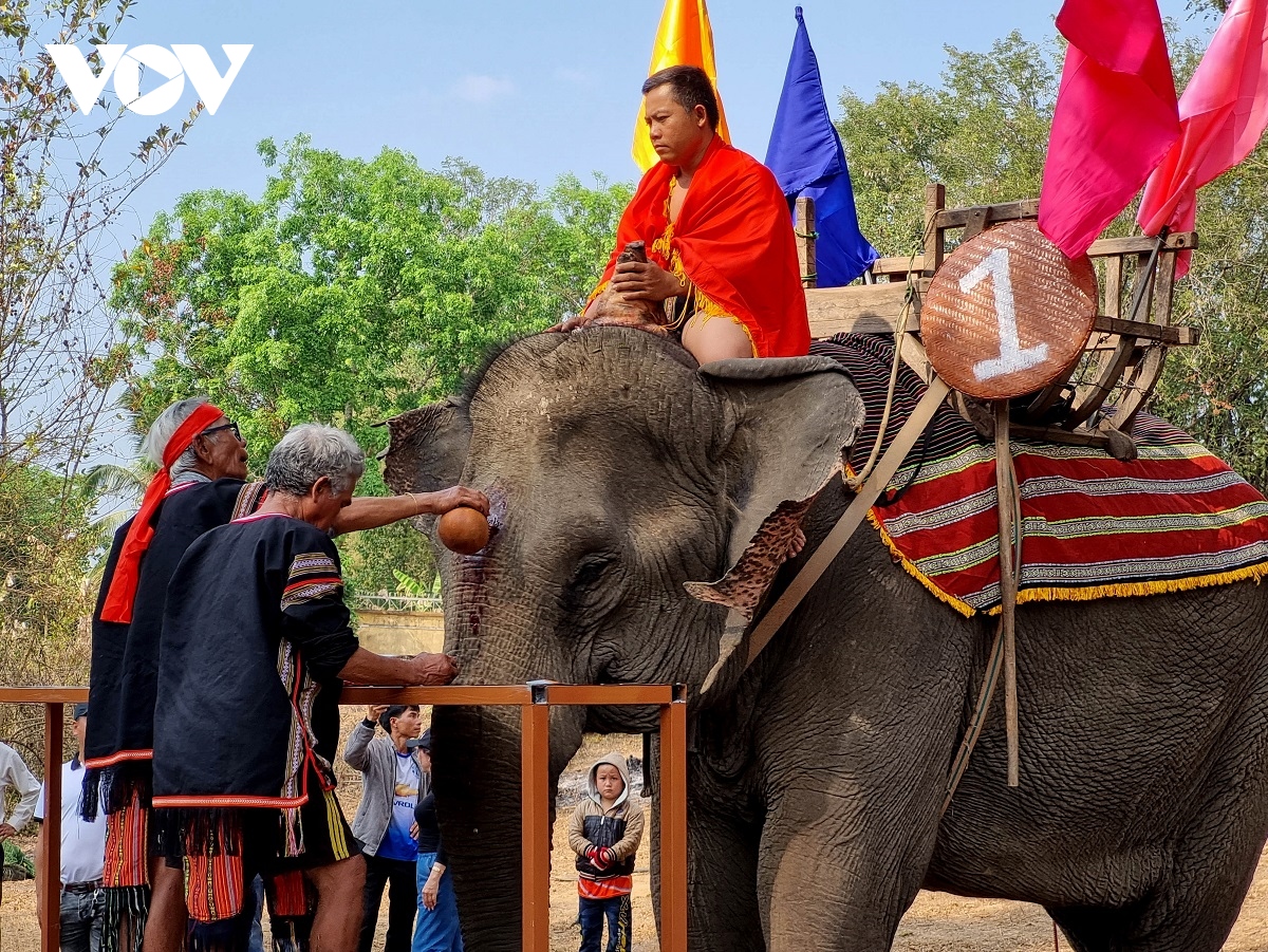 After preparing offerings for the ceremony, organisers covered the elephants' backs with brocade. The mahouts then rode the elephants to the ceremonial area. (Photo: H Xiu/VOV)