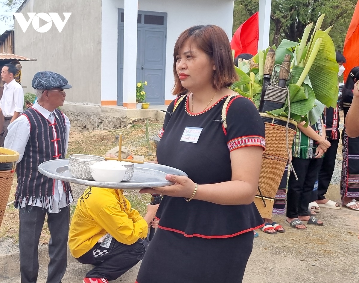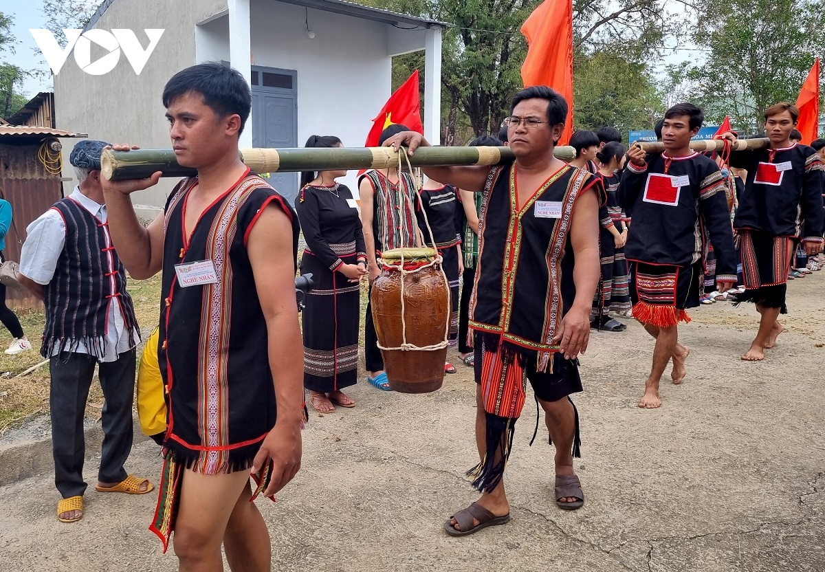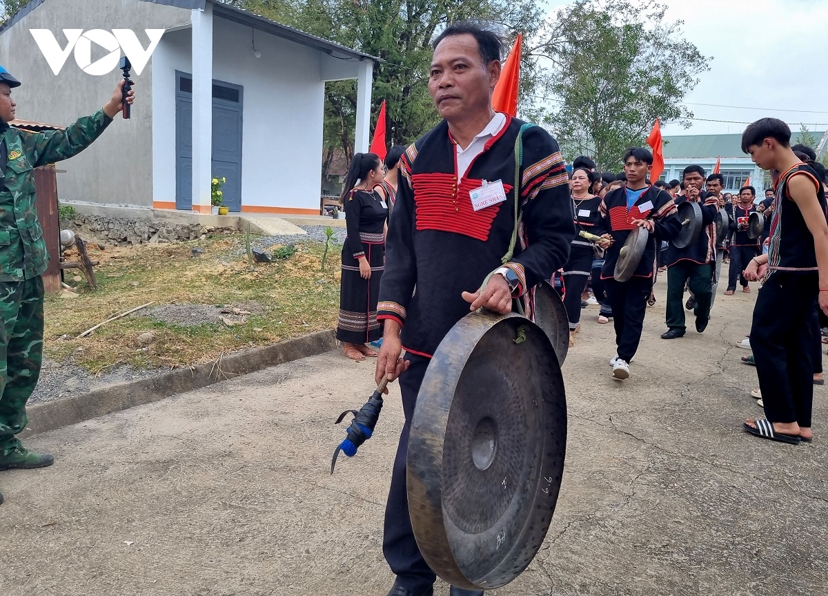 The commence the ceremony, a shaman holding a dried gourd led a group of people carrying the offerings from Don hamlet's communal house. (Photo: H Xiu/VOV) |