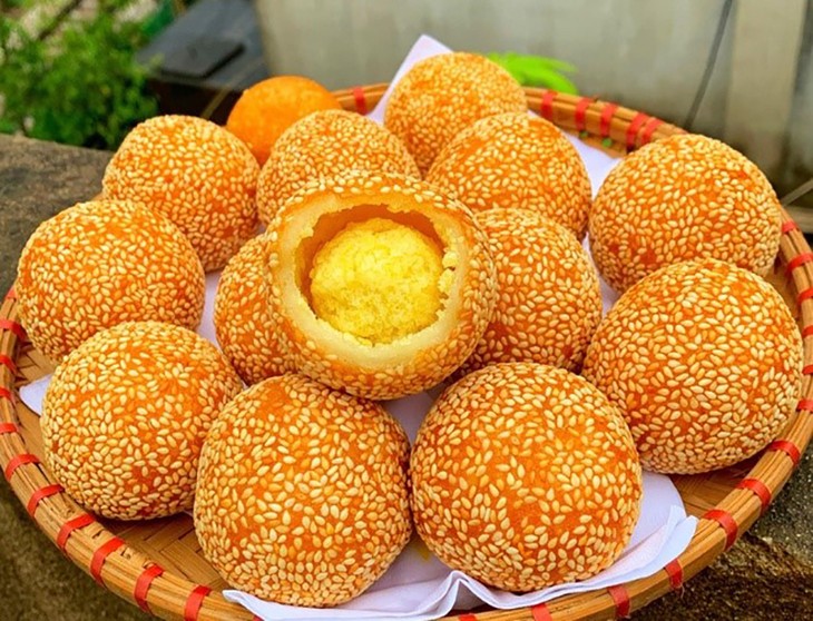 Banh ran is named Banh cam (Orange cake) by Vietnamese southerners because of its shape and color similar to oranges. Banh ran is made from sticky glutinous rice flour with green bean filling, coated with white sesame seeds or honey. Photo: foodnews.com