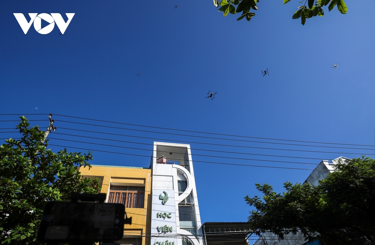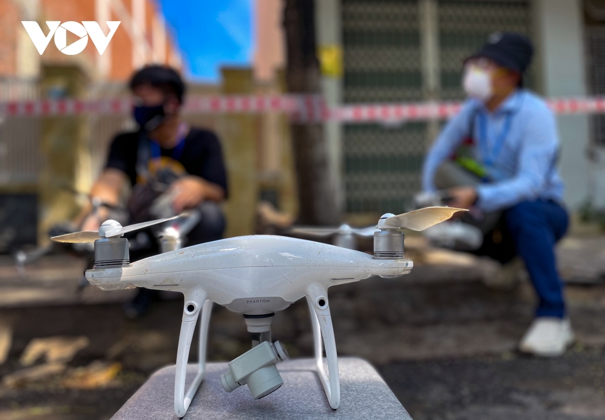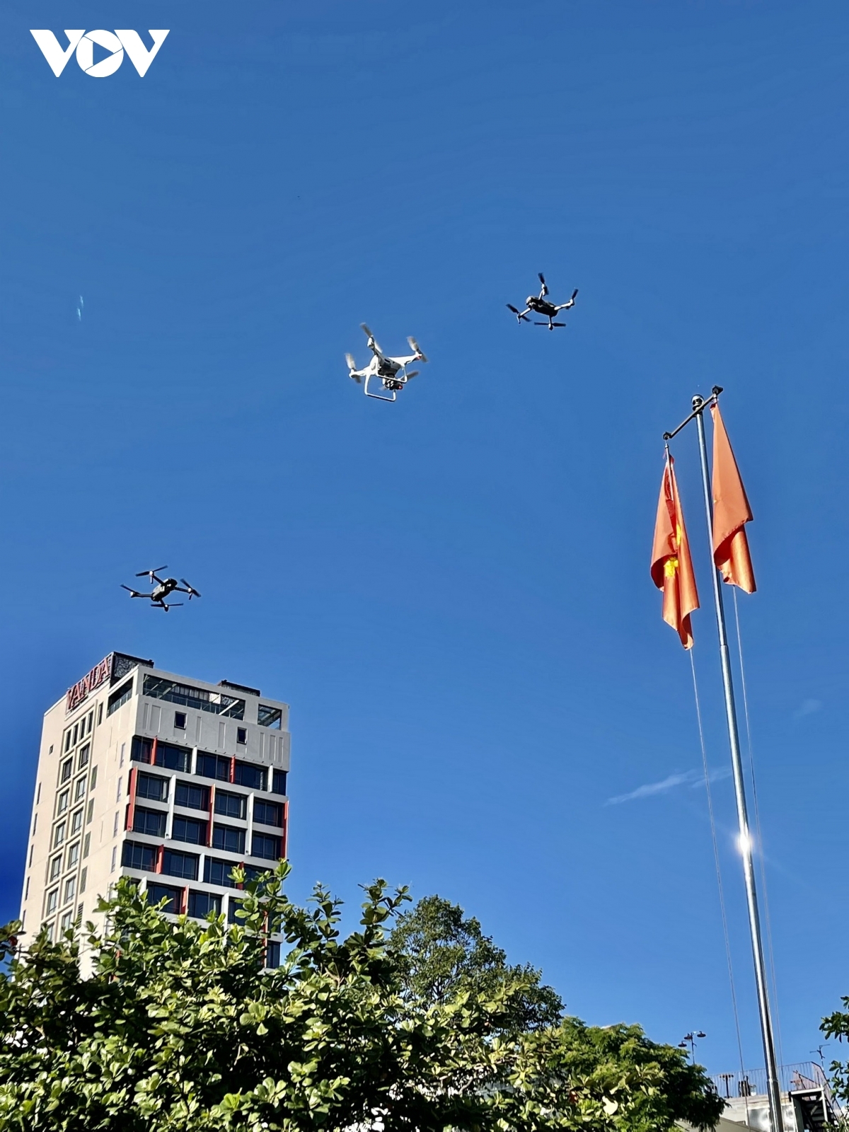 The administration of Hai Chau district mobilises 14 drones aimed at monitoring residents in high-risk areas, including Hoa Thuan Dong, Binh Hien, and Thach Thang wards. |