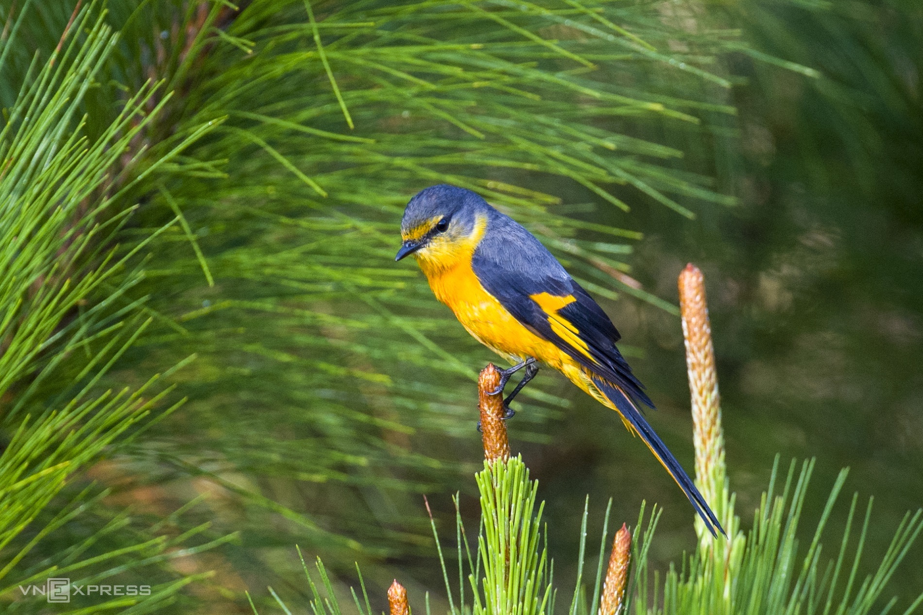 Long-tailed Minivets (Pericrocotus ethologus) can be observed near Tuyen Lam Lake. The female long-tailed minivet has a yellow forehead and rump, grayish crown, nape, ear coverts and back.