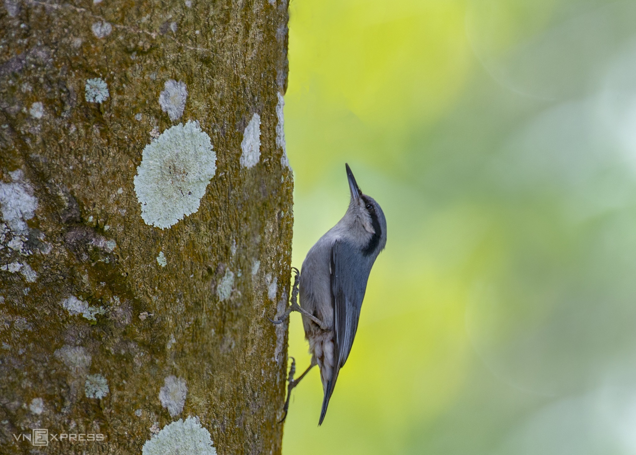 The chestnut-vented Nuthatch (Sitta nagaensis) has long black eye stripes, blue-grey crown and upperparts, white neck, light brown lowerparts and chestnut-brown lower tail feathers. The species is always active, social, and follows mixed flocks.