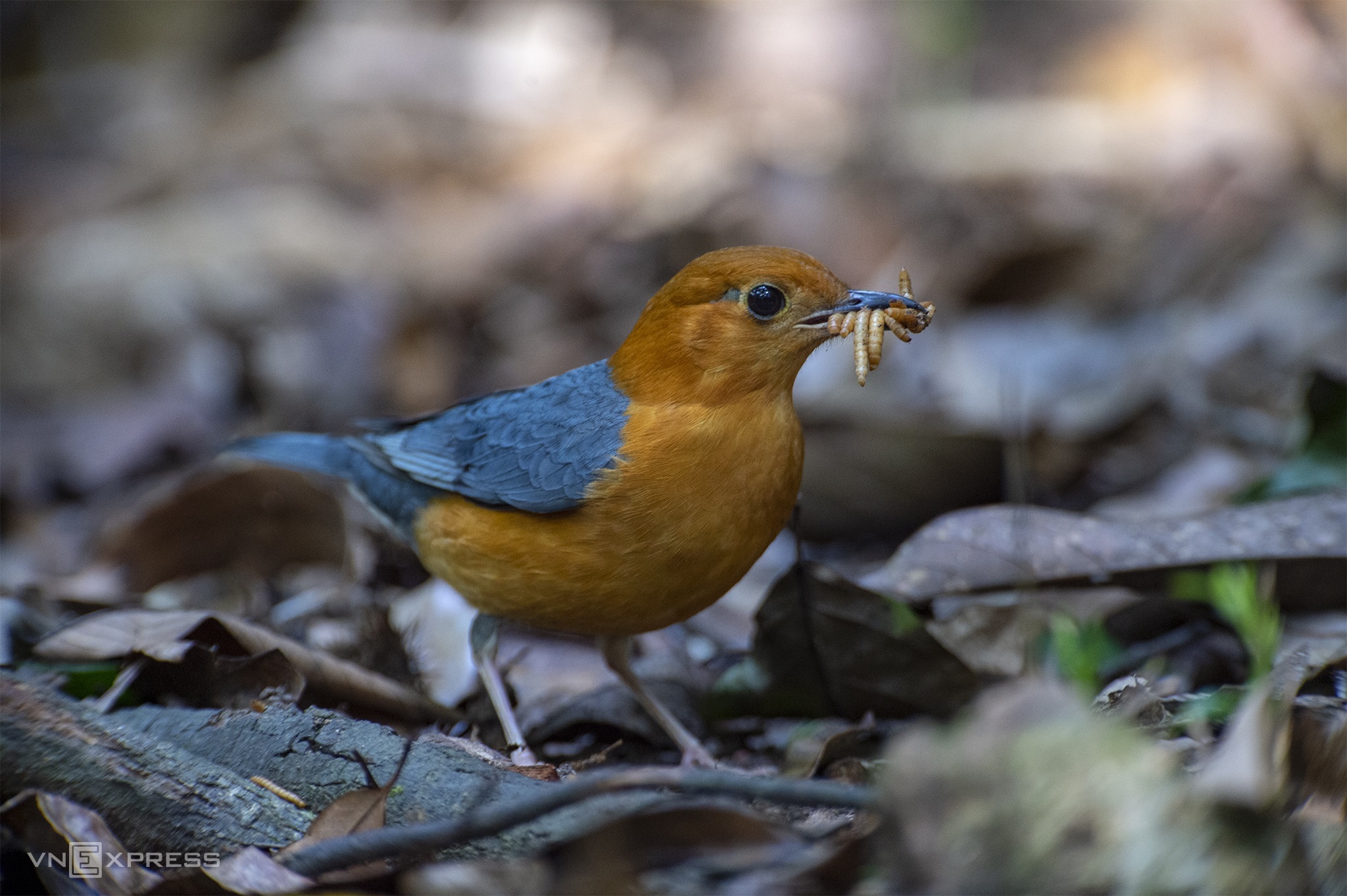 An orange-headed thrush (Geokichla citrina) with a beak full of prey to feed its young. The species has an entirely orange head and underparts, uniformly grey upperparts and wings. The orange-headed thrush is omnivorous, eating a wide range of insects, earthworms and fruit. It nests in trees but does not form flocks.
