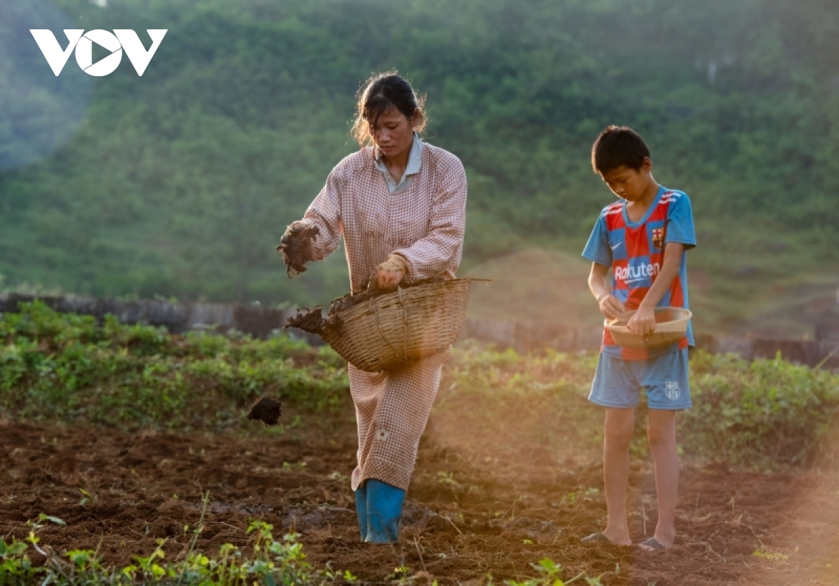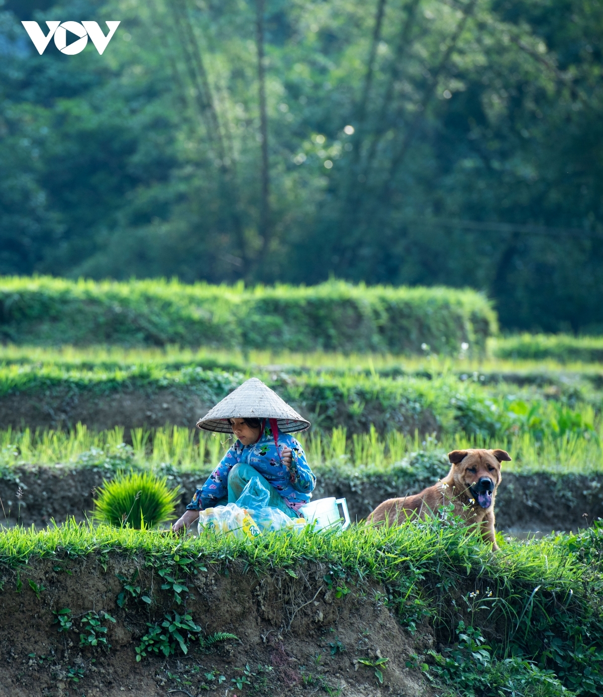 A busy day sees a girl and her friend working in the harvest season in Trung Khanh district of Cao Bang province. |