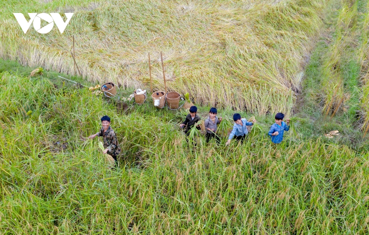 A group of boys aged 13 to 14 assist their parents as they harvest rice in Bao Lac district of Cao Bang province. |