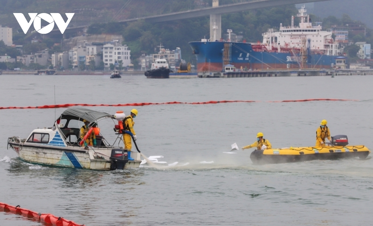 The simulated situation helps to train, test and enhance the interoperability of relevant forces in handling oil spills on Ha Long Bay. |