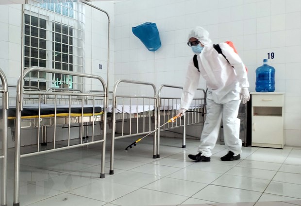 | Spraying disinfectant Chloramine B at Quang Ha clinic. (Photo: Hoang Hung/VNA) |