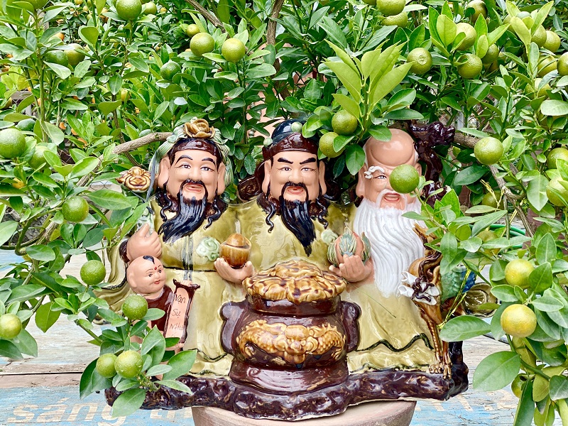 A pot featuring the statues of three gods representing Happiness, Luck and Longevity expresses the wish for the new year. |