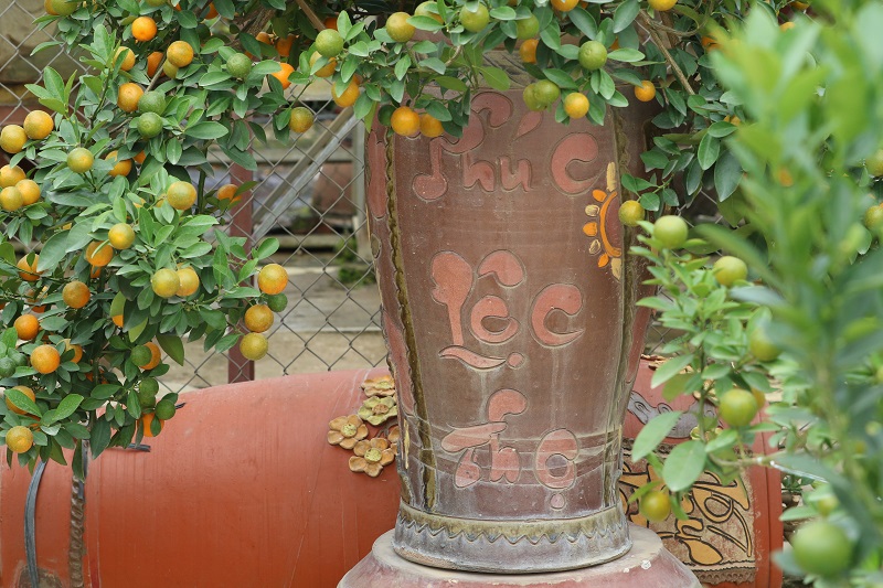 A kumquat tree is planted in a pot crafted with Vietnamese words of Happiness, Luck, and Longevity. |