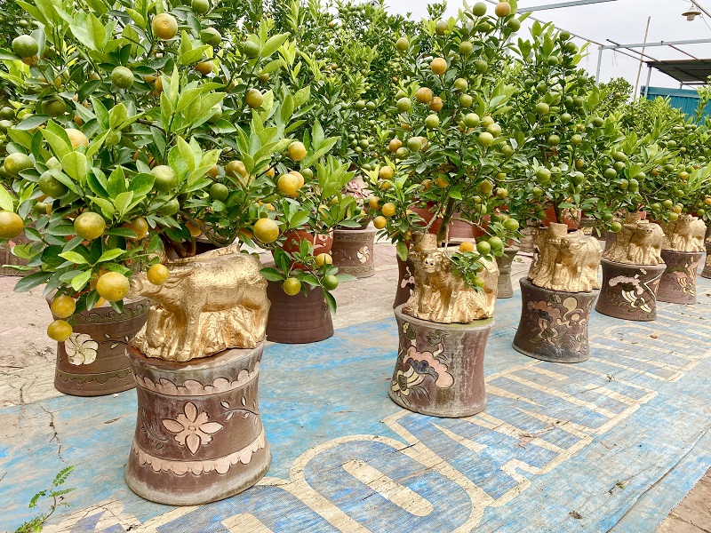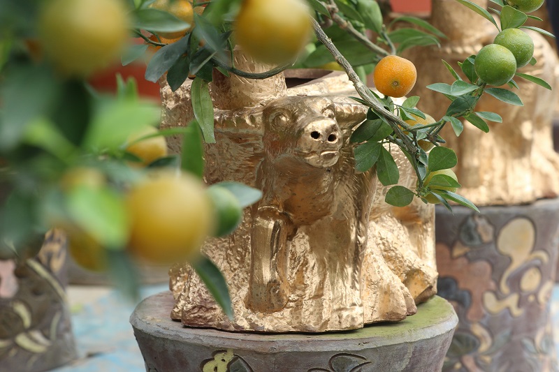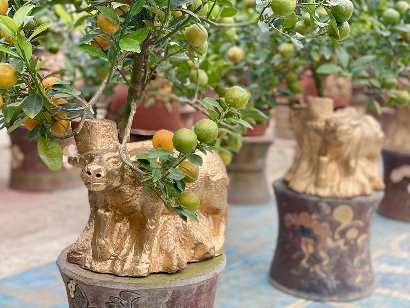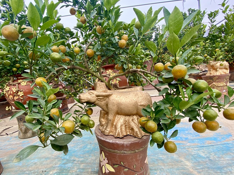 | In recent years, kumquat bonsai grown on pots in the shape of zodiac animals are well received thanks to their impressive and unique shape. This year, golden buffalo carrying kumquat trees are an attractive product for many people. |
