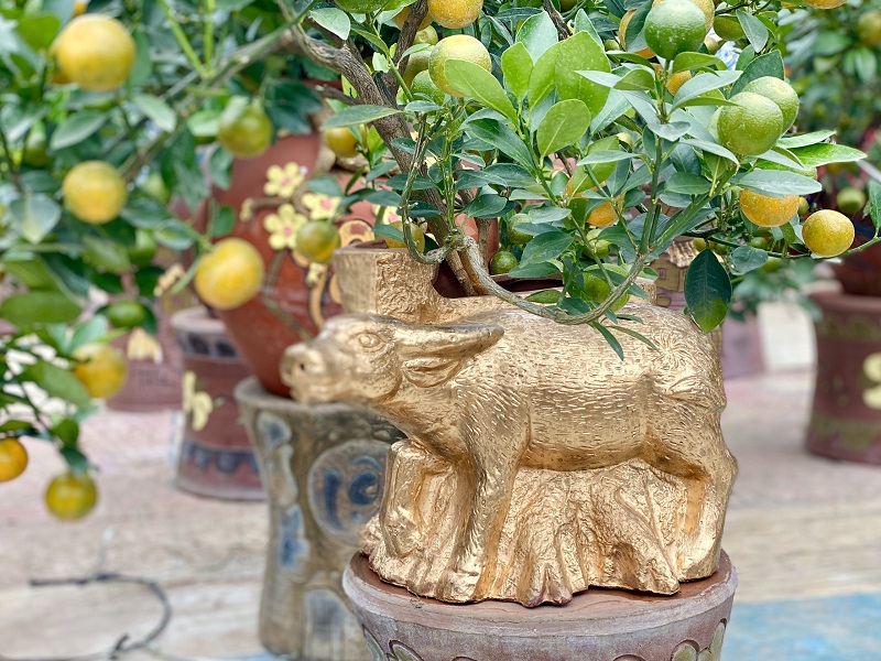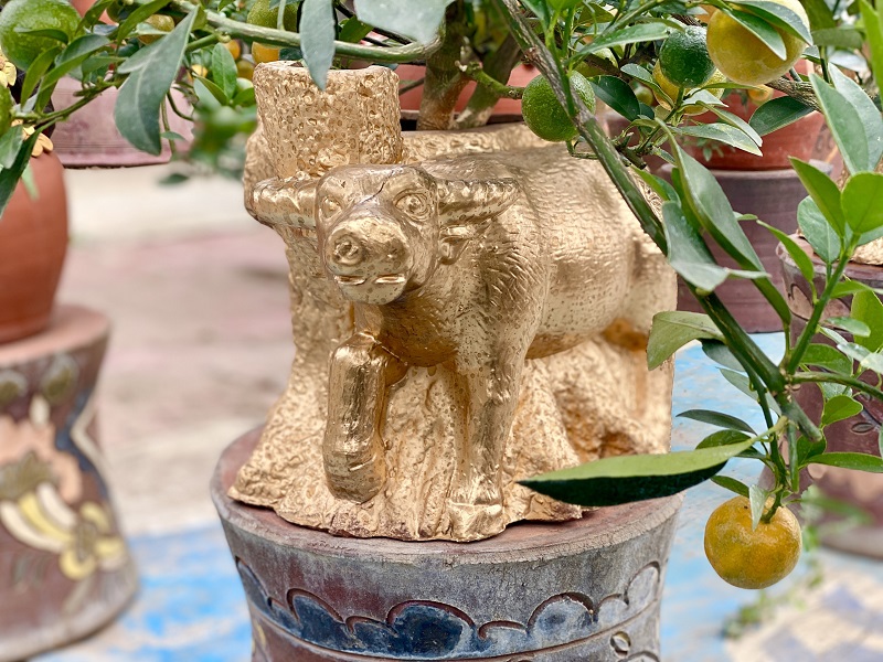 | According to some garden owners, kumquat bonsai positioned on a golden buffalo brings special meaning. |