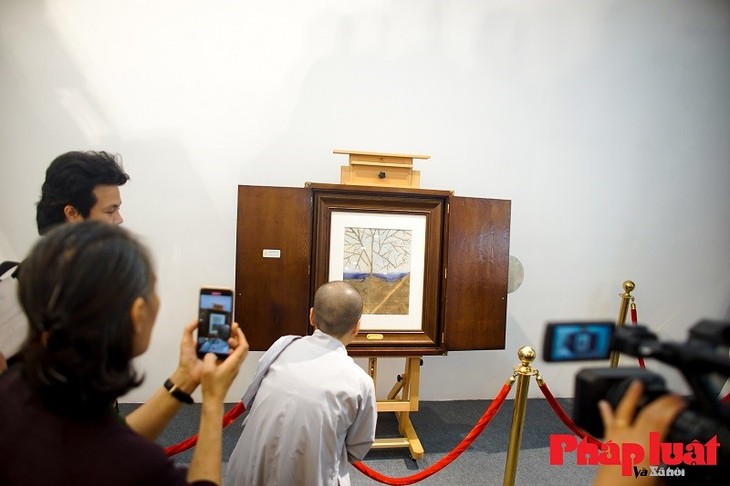 Aside from the lotus-themed works, visitors appreciate the original "Vo Tuong Lai" (Cover of Future) painting by artist Kim Duc. This world-famous picture sends a strong message of environmental protection and climate change, and was debuted at the UN Vesak Festival 2019. (Photo: phapluatxahoi.kinhtedothi.com)