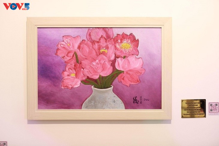 The exhibition showcases 75 paintings worth 20 million USD on the theme "Lotus" by Kim Duc. (Photo: Le Chi, Tuan Minh)