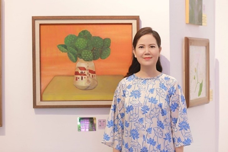 Kim Duc poses with her paintings at the exhibition (Photo: dangcongsan.vn)