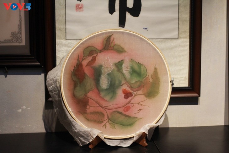 Hand-embroided silk paintings being displayed at the Tu Thi Communal House.