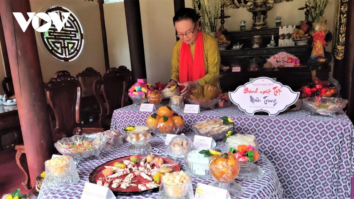 During the duration of the festival 150 booths are present to showcase the food and delicacies of each region nationwide. Photographed is artisan Ho Dac Thieu Anh arranging the traditional food of the central region. |
