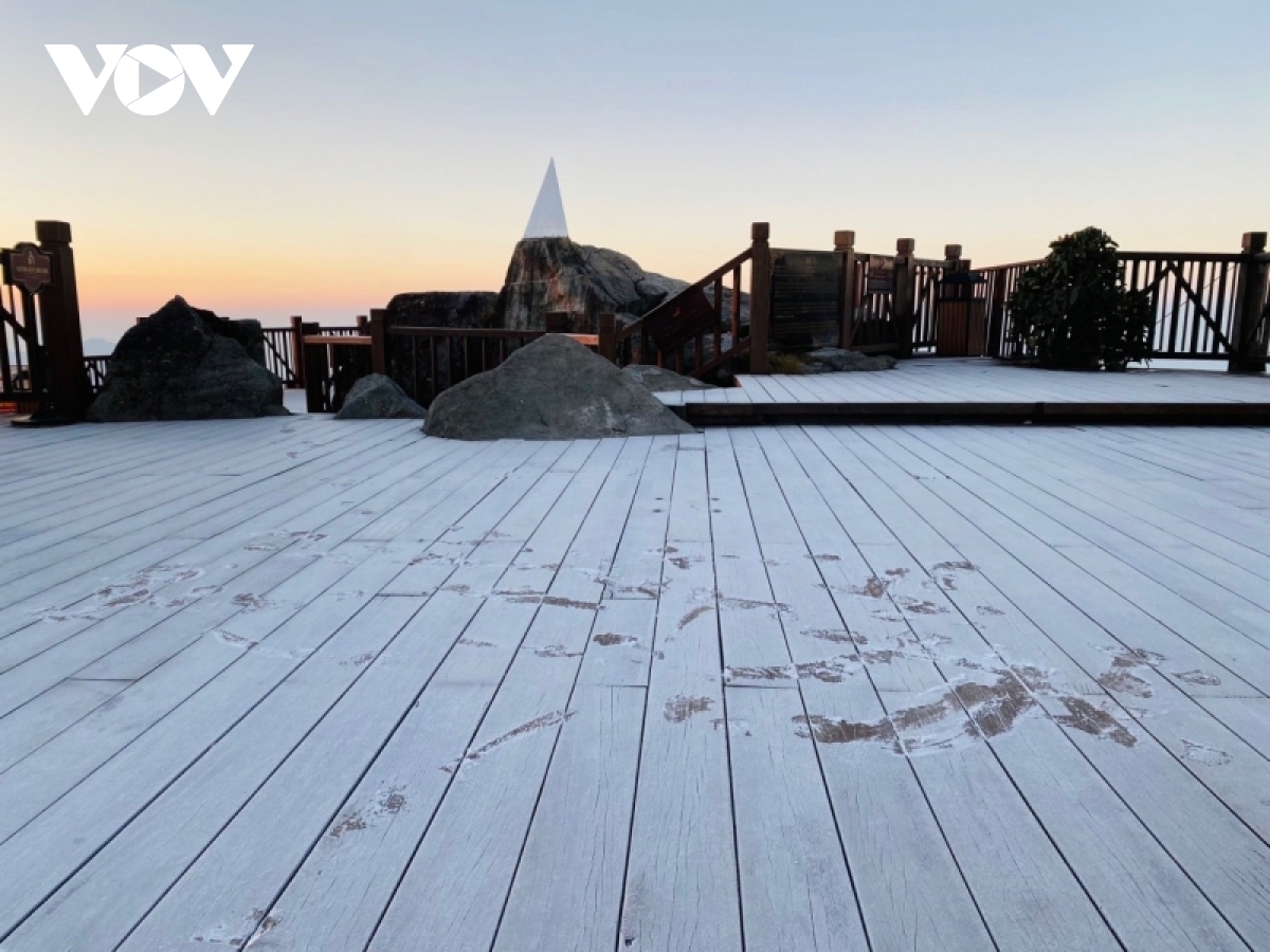 ![]() Tourists were thrilled at the sight of frost on the famous peak. (Photo: VNA/VNS) |