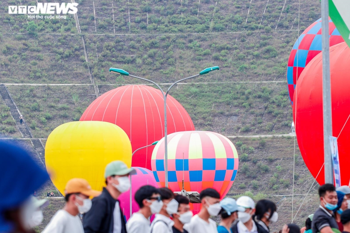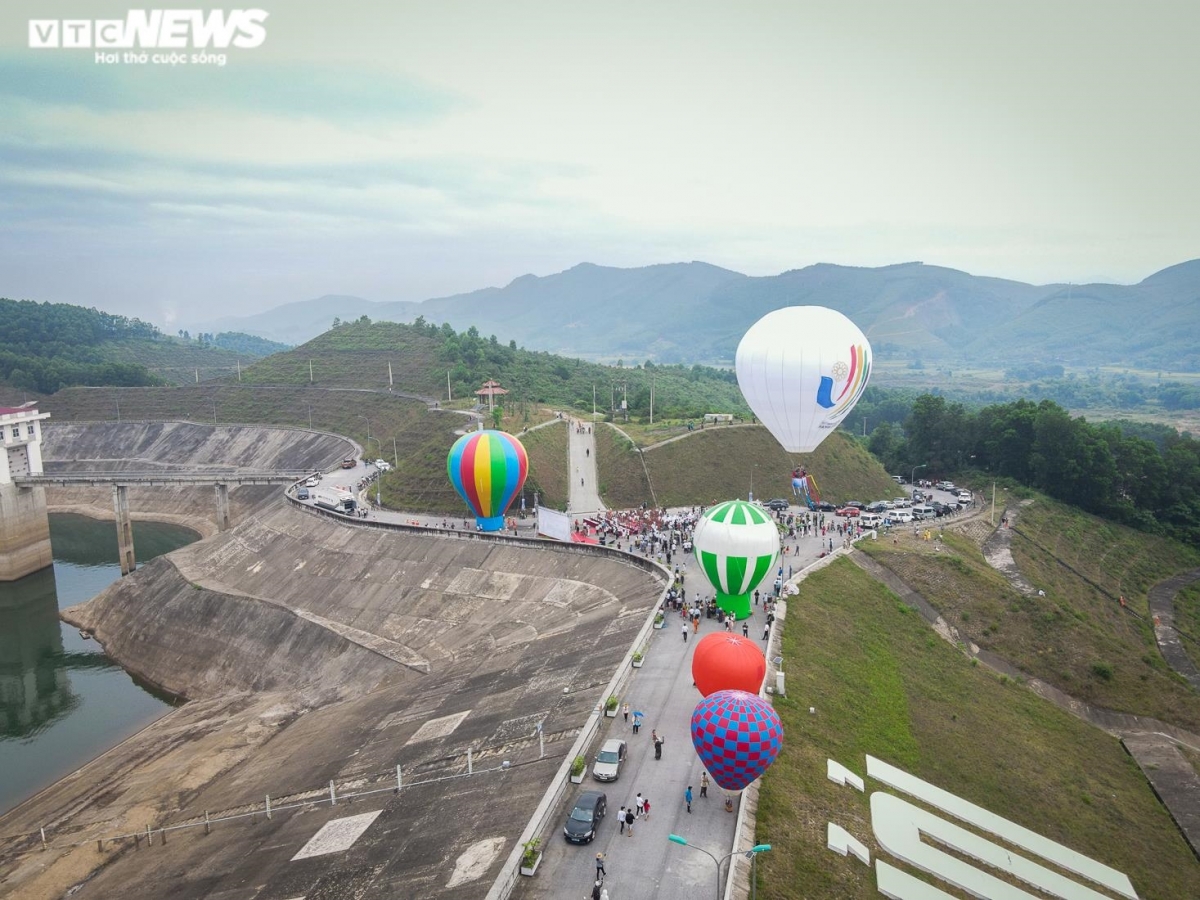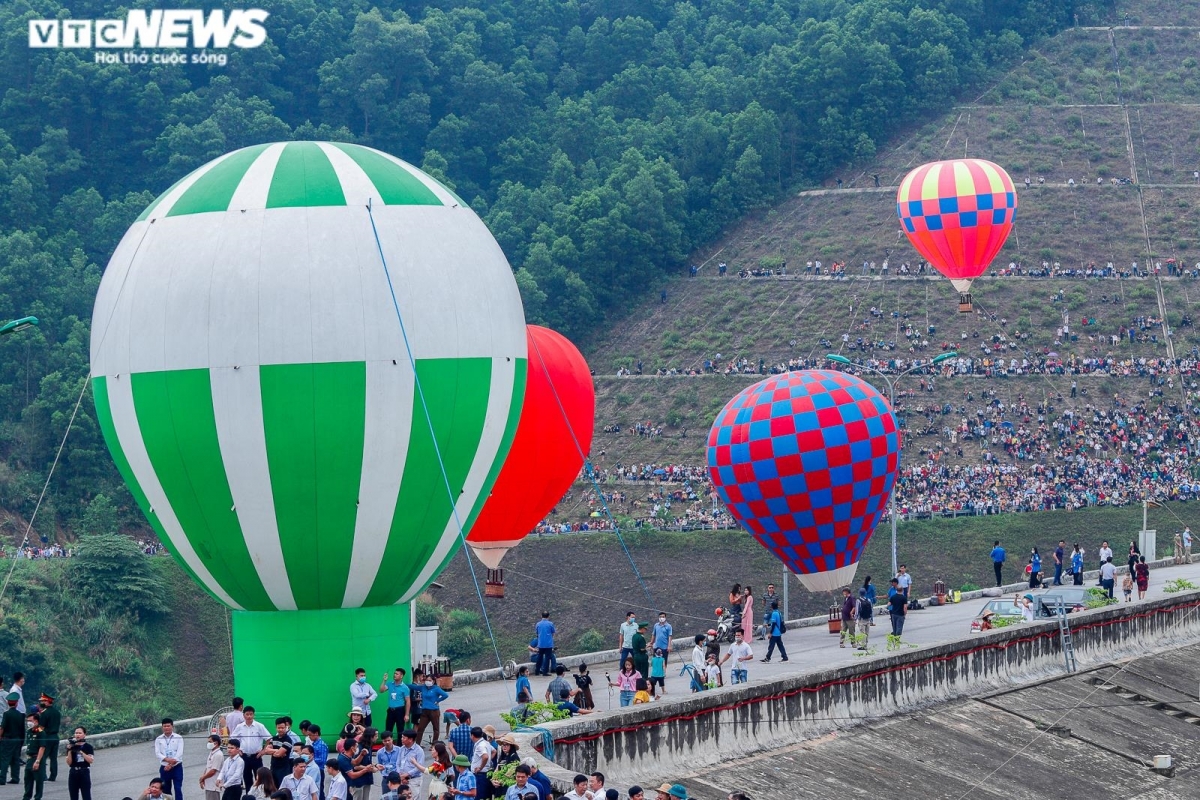 Crowds of people eagerly flock to the main dam of Ngan Trui irrigation lake to witness the hot air balloons taking to the skies with their own eyes. |