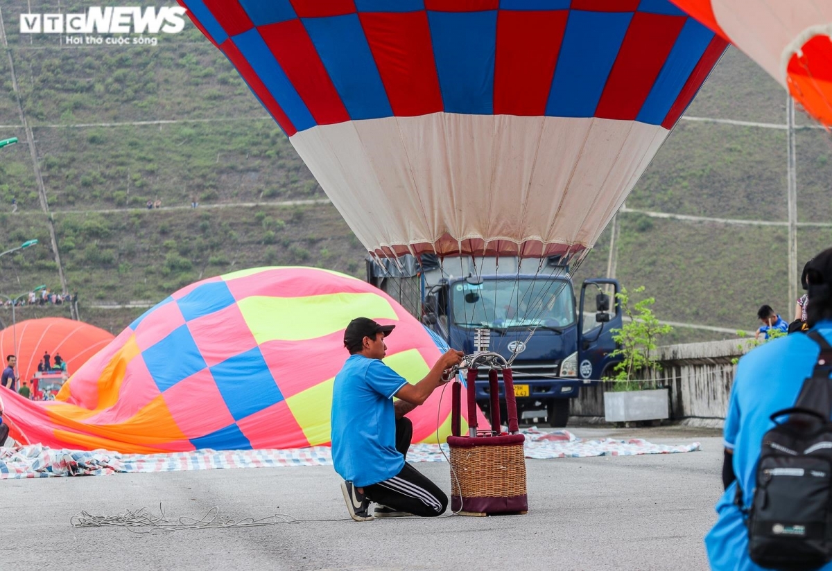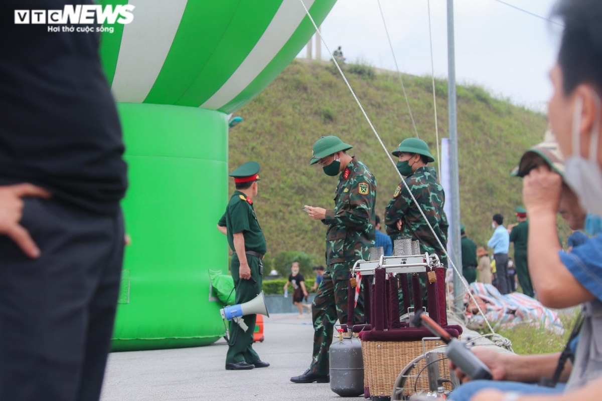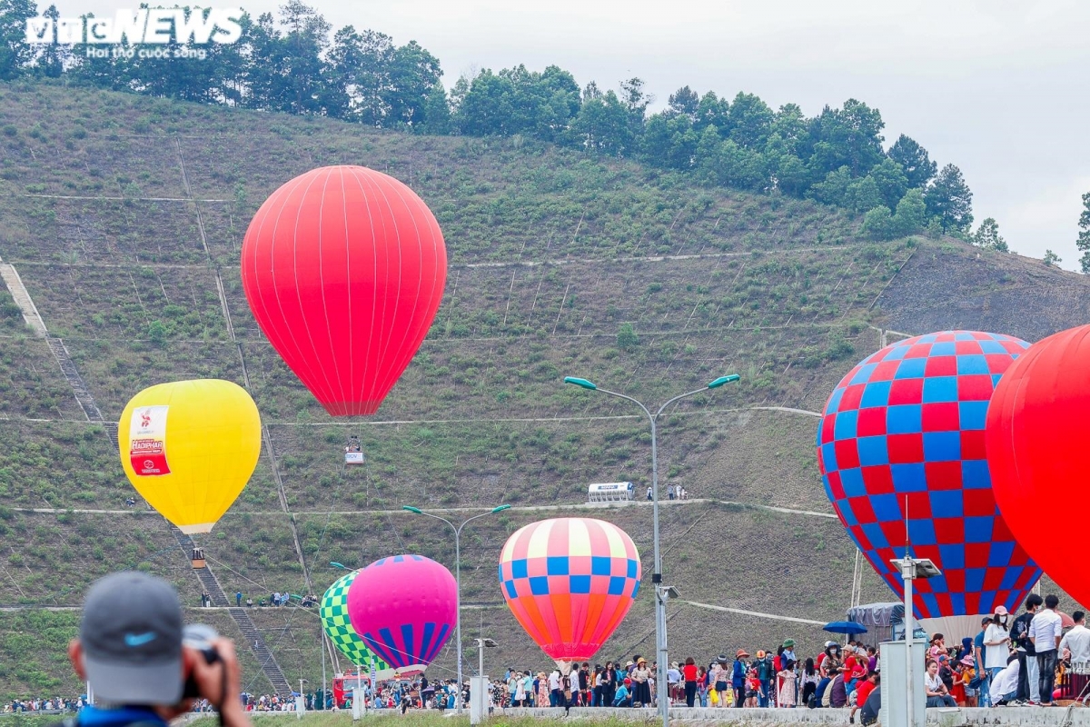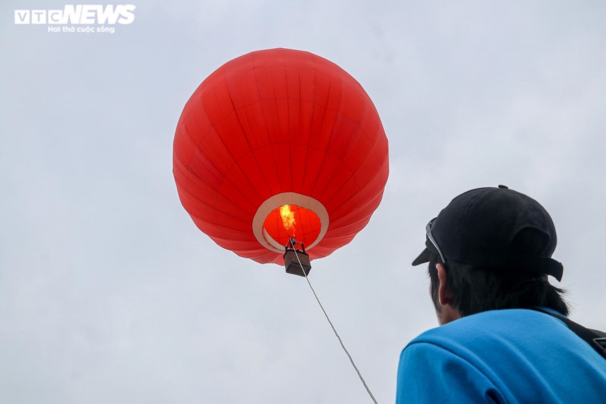 Crowds of people eagerly flock to the main dam of Ngan Trui irrigation lake to witness the hot air balloons taking to the skies with their own eyes. |