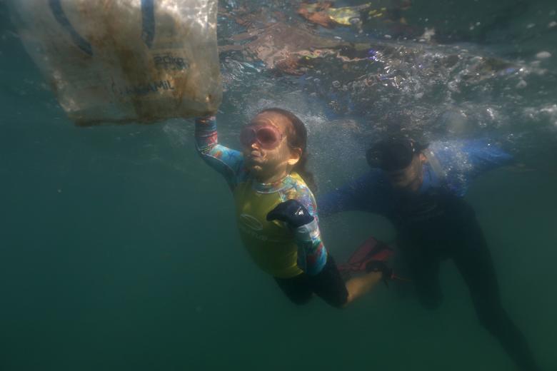 Nina Gomes collects garbage on the sea accompanied by her father Ricardo Gomes. REUTERS/Pilar Olivares |