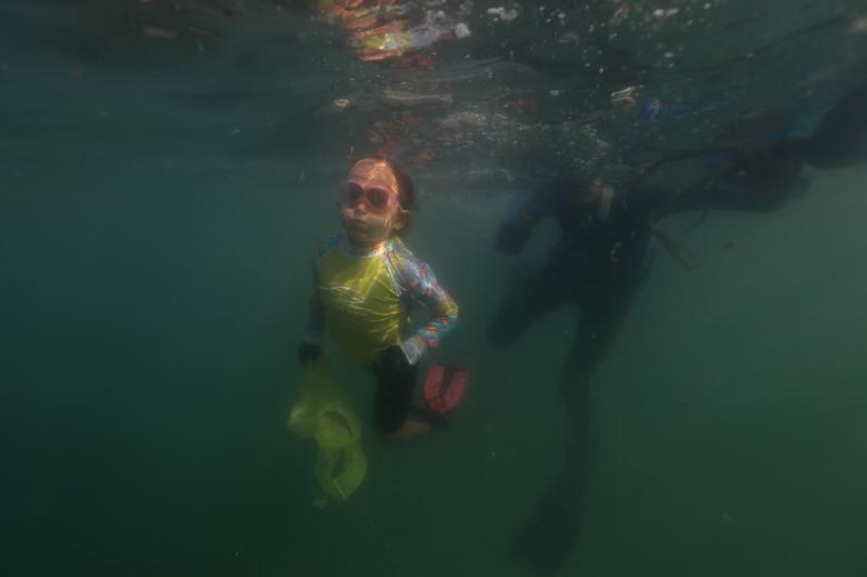 With bright pink goggles and just 4 years old, she picks trash with her father from the water along the beaches of Rio de Janeiro |