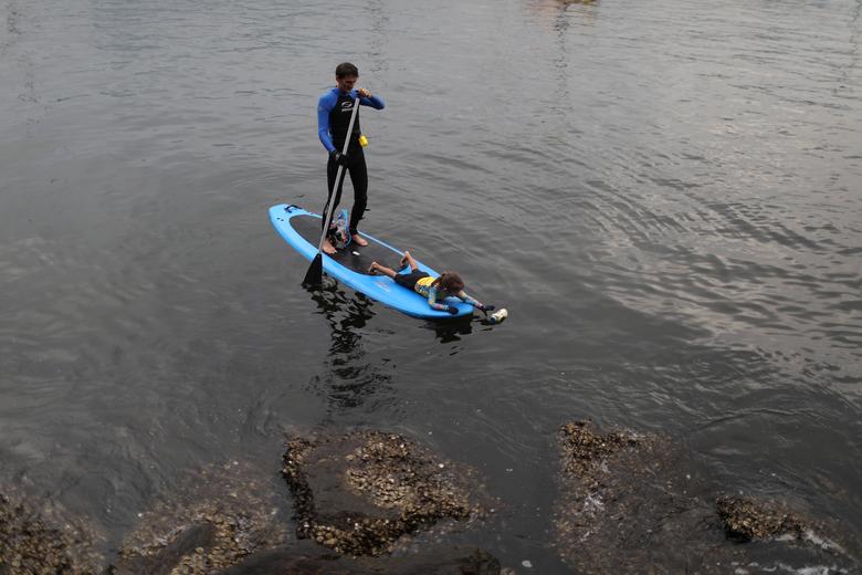 "She is already a mini-defender of the ocean," her father said. With Nina in tow, Gomes sets out on a paddleboard into the picturesque but polluted waters of Rio's Guanabara Bay, where she grabs plastic bottles and bags and puts them in a mesh net. REUTERS/Pilar Olivares |
