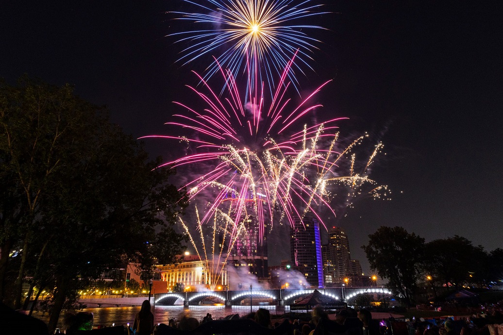 The Fourth of July fireworks show is seen from Ah-Nab-Awen Park in Grand Rapids, Mich., on Saturday, July 3, 2021. (Photo: JOEL BISSELL, KALAMAZOO GAZETTE VIA AP) |