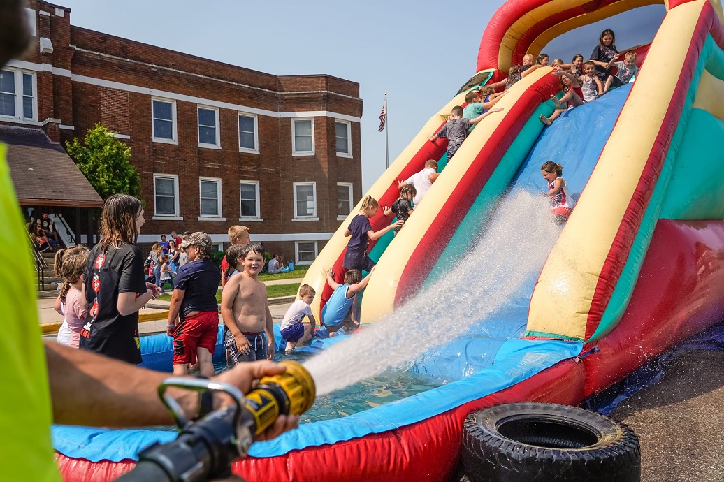 Newberry Fire Fighter Mike Blackmer sprays children riding down an inflatable slide after the 4th of July parade in Newberry, Mich. on Saturday, July 3, 2021 in Michigan's Upper Peninsula. (Photo: RYAN GARZA, DETROIT FREE PRESS/USA TODAY NETWORK) |