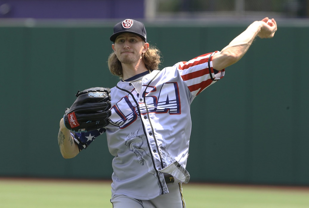 Milwaukee Brewers relief pitcher Josh Hader warms up in a Fourth of July themed jersey in honor of Independence Day before the game against the Pittsburgh Pirates at PNC Park. (Photo: CHARLES LECLAIRE, USA TODAY SPORTS) |