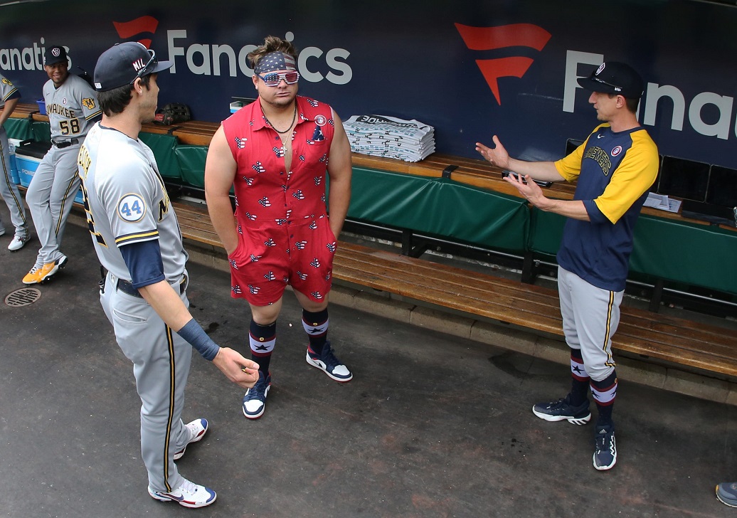 Milwaukee Brewers left fielder Christian Yelich, left, and manager Craig Counsell react to the Independence Day themed outfit worn by infielder Daniel Vogelbach against the Pittsburgh Pirates at PNC Park. (Photo: CHARLES LECLAIRE, USA TODAY SPORTS) |