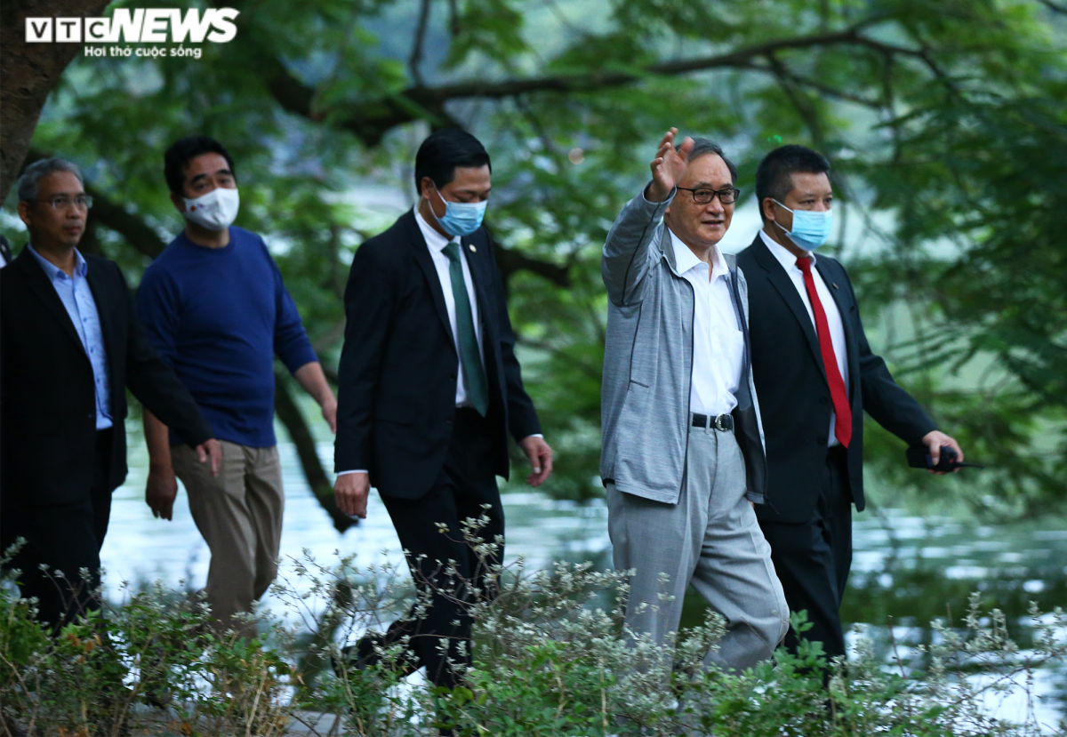 Prime Minister Suga Yoshihide accompanied by his assistants goes for a walk along Hoan Kiem Lake in Hanoi on the morning of October 20.