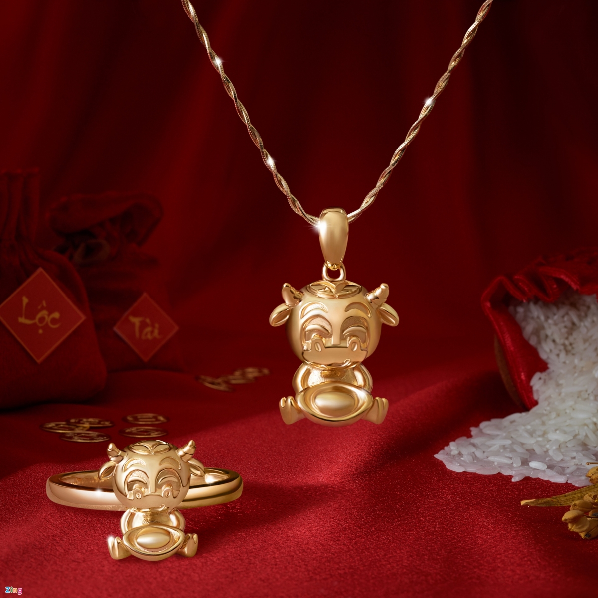 A collection of 18k gold items sends a message of happiness, peace, and wealth. Necklaces are priced at VND6 million each, whilst rings are valued at VND8 million each. |