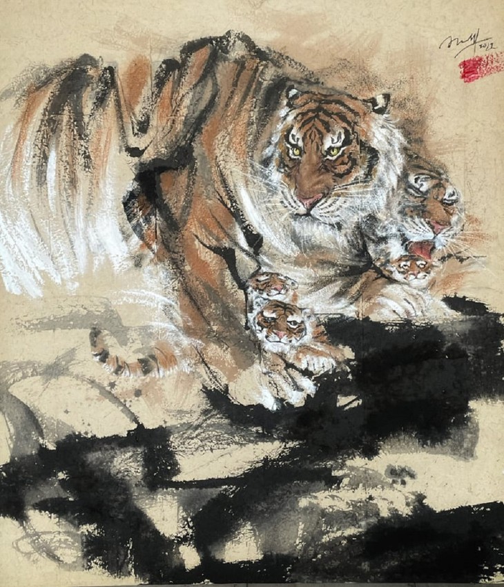 In recent years, zodiac animals have provided a wealth of inspiration for Ninh whenever Tet arrives. This is the first time he has painted tigers. The more he studies tigers, the more he loves painting them. There are 48 paintings in his collection this year, which is his age. Ninh depicts tigers as the majestic lord of the jungle and at times a warm-hearted nurturer.