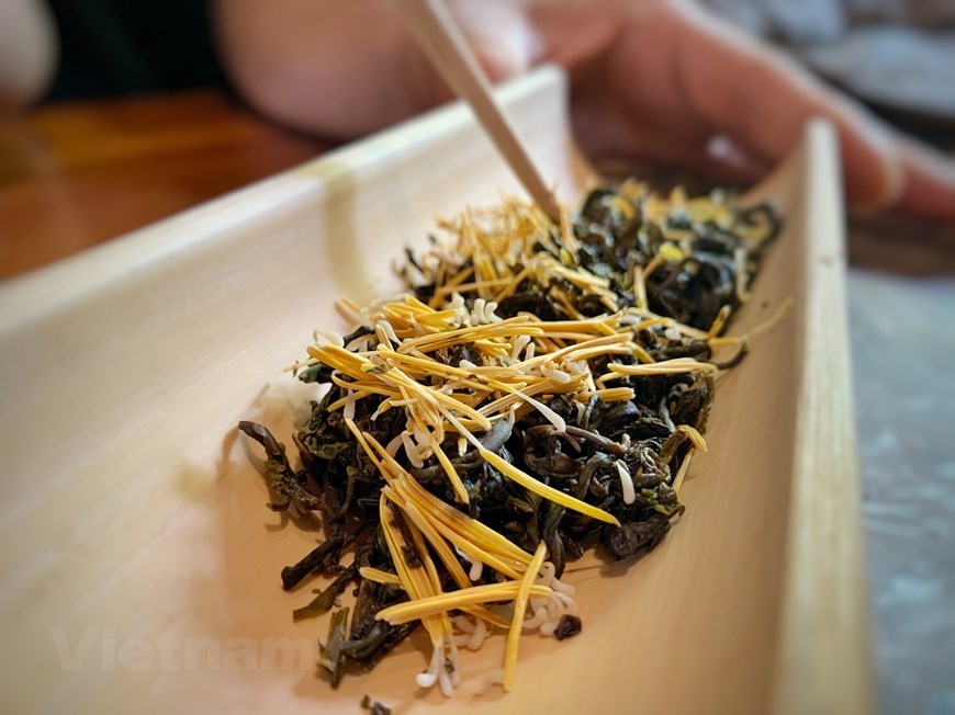 One of the best types of lotus tea is Shan Tuyet tea stuffed in ‘hundred-petal’ lotus buds. |
