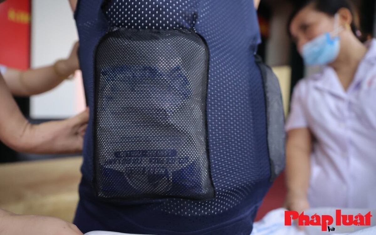 The thermal shockproof T-shirt does not interfere with the design of the protective gear. The dry ice bags in the shirt weigh some 500 grams and are wrapped by a layer of insulation foam with a thickness of 1cm to prevent the ice from directly touching the human skin. They are also placed in a zip bag for water proofing. (Photos: phapluatxahoi.vn)