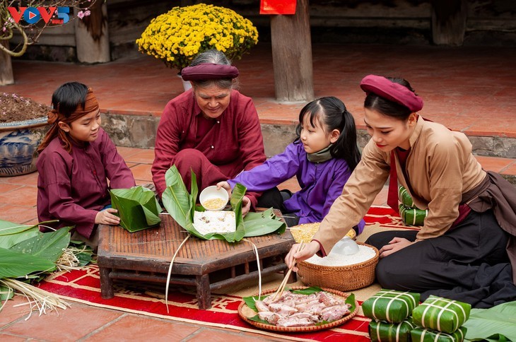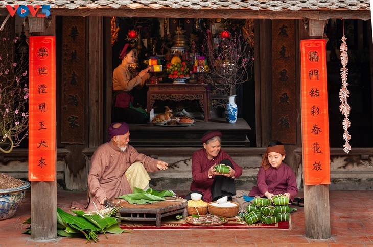 These days, people just need to place an order to get a pair of Chung (square sticky rice) cakes. In the past, families gathered and prepared Dong leaves, glutinous rice, green beans, and pork to make Chung cake. |